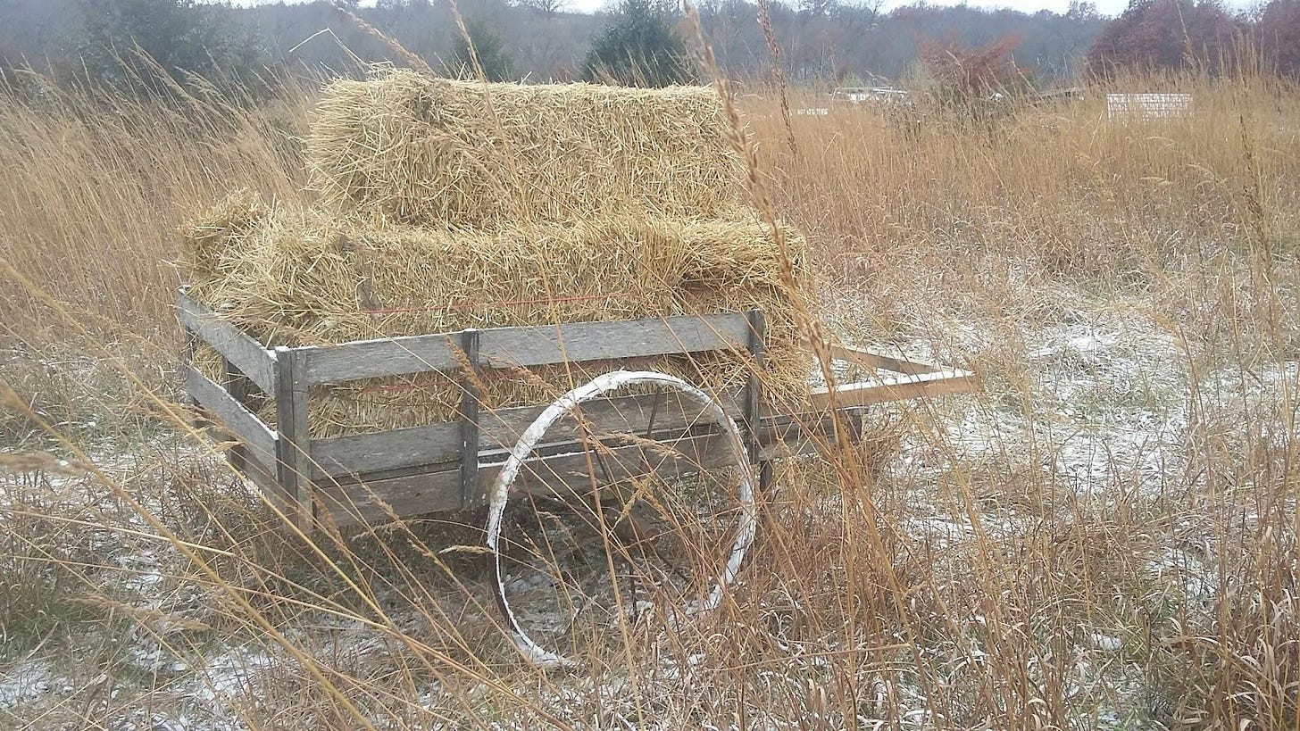 You’ve gotta have a cart. Manufactured garden carts and wheelbarrows work fine for smaller amounts of hay, but piling a great big cart full of the stuff and pinning it in place with a pitchfork is more efficient, functional, and aesthetic. It is important that a home-built cart have some protection alongside the wheels so that loose hay isn’t sucked into the wheel hubs.