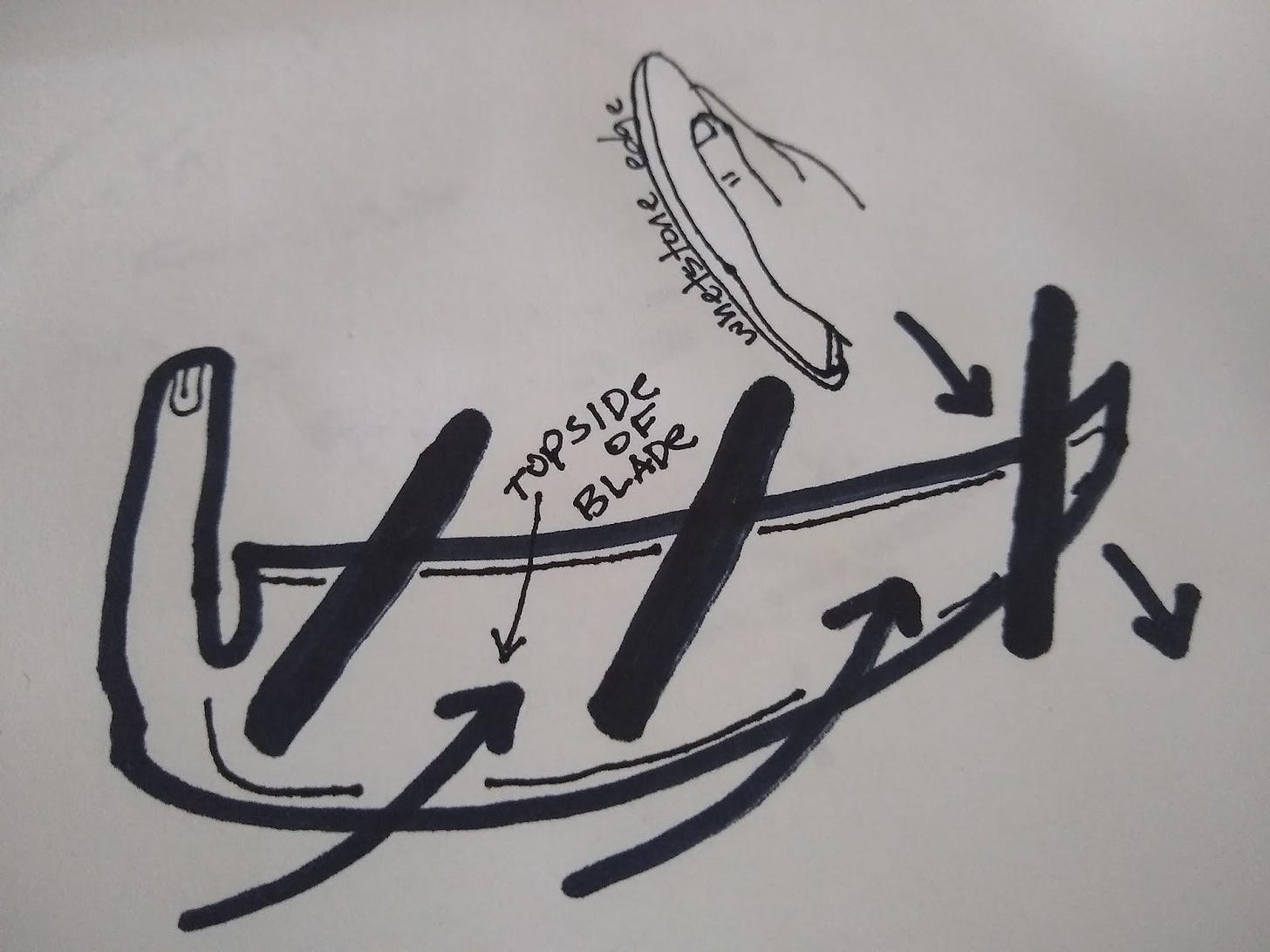 Once you’ve gotten confident peening on a jig, you can graduate to the hammer and anvil, if you choose. These are scythe-specific peening hammers and anvils. They’re great for getting the edge to your preferred thickness or for working with old, “dynamically shaped” (beat to hell) blades. Extra thick blades that are not “supposed to” be peened, like some bush blades, kamas, and sickles can be convinced otherwise. A scythe peening hammer has a narrow, wedge-shaped side and a flatter, wider side. The primary two anvils used for free-hand peening are nearly the same: one flat and one wedge-shaped, and the blade is typically held face down to the anvil, as opposed to the peening jig where the blade is held face up. Using a narrow hammer on a narrow anvil will shape the edge more drastically. It is very easy to over-peen a blade this way, and uneven hammering can produce a rippling shape across the edge. Moving through the four possible combinations of hammer and anvil, we can adjust how effectively the edge is shaped. It’s probably best to take it easy and make only slight changes to the edge at first. The more “effective” combinations can be used in areas where the edge is further out of shape, whereas the subtlest combination, that is, flat-to-flat, is great for hardening the steel (compressing the drawn-out molecules) along the thinned, finished edge.